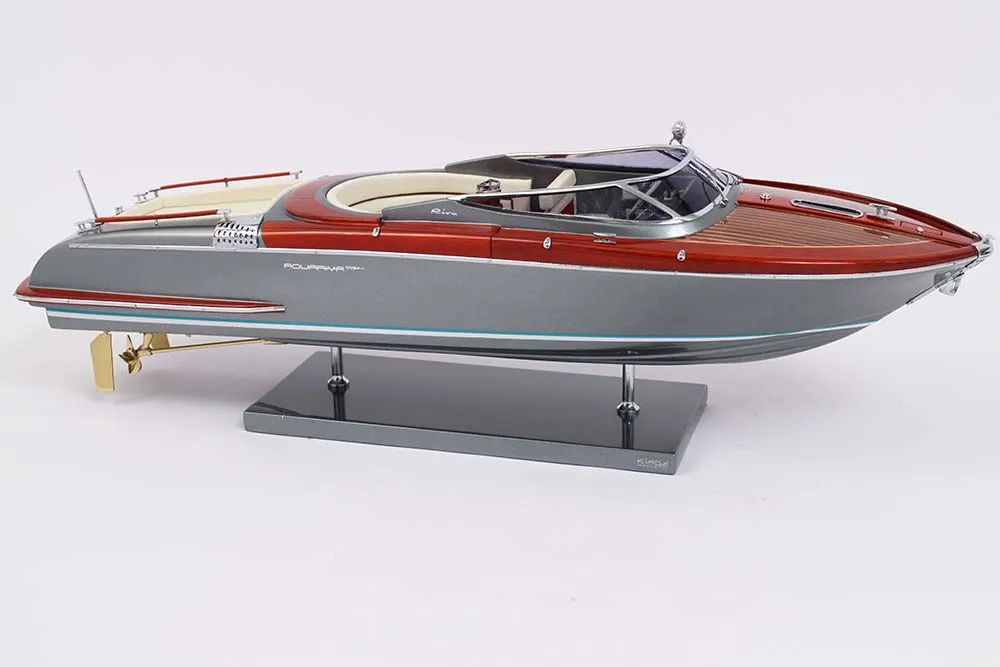 Dieses 56 cm lange Aquariva-Modell wurde im Maßstab 1:18 angefertigt. Als originalgetreue Nachbildung der eleganten Aquariva wurde dieses exklusive offizielle Modell vollständig von Hand gefertigt. Der Rumpf wurde nach den Originalplänen aus Glasfaser und Polyester gefertigt. Alle Beschläge sind aus verchromtem Messing und wurden von Juwelieren nach Maß angefertigt. Für die Sitze und das Sonnendeck wurde eine echte Schiffssattlerei verwendet. Das Deck wurde mit 10 Schichten Lack überzogen, um einen hervorragenden Glanz und eine hohe Lacktiefe zu erzielen. Auf dem Rumpf wird eine Metallic-Lackierung aufgetragen.