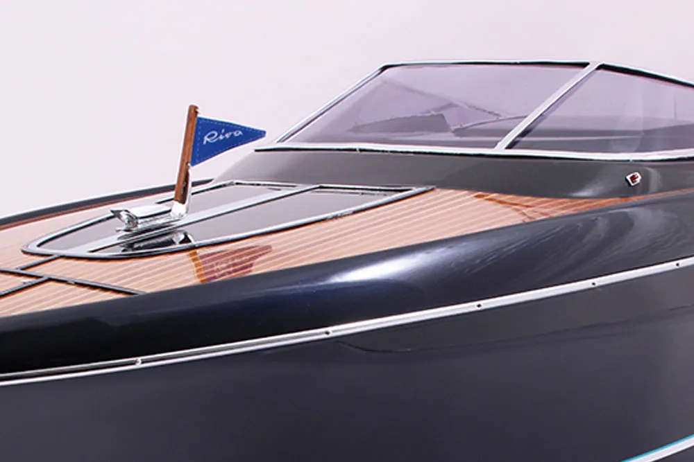 Dieses Modell ist eine originalgetreue Nachbildung des neuesten Modells der Riva-Reihe und wurde vollständig von Hand gefertigt. Der Rumpf wurde nach den Originalplänen aus Glasfaser und Polyester gefertigt. Alle Beschläge sind aus verchromtem Messing und wurden von Juwelieren nach Maß angefertigt. Für die Sitze und das Sonnendeck wurde eine echte Schiffssattlerei verwendet. Das Deck wurde mit 10 Schichten Lack überzogen, um einen hervorragenden Glanz und eine hohe Lacktiefe zu erzielen. Auf dem Rumpf wird eine Metallic-Lackierung aufgetragen.