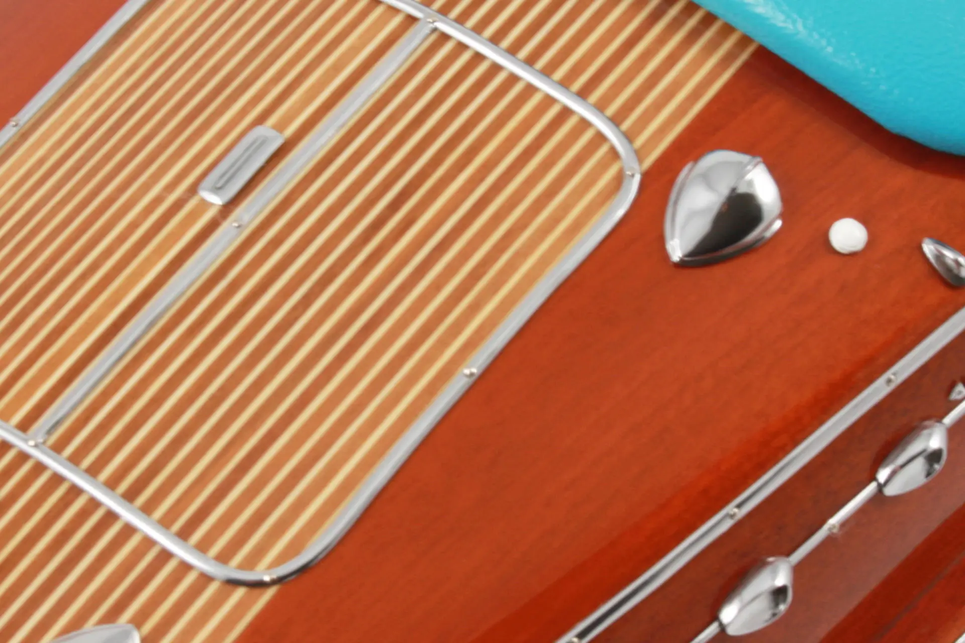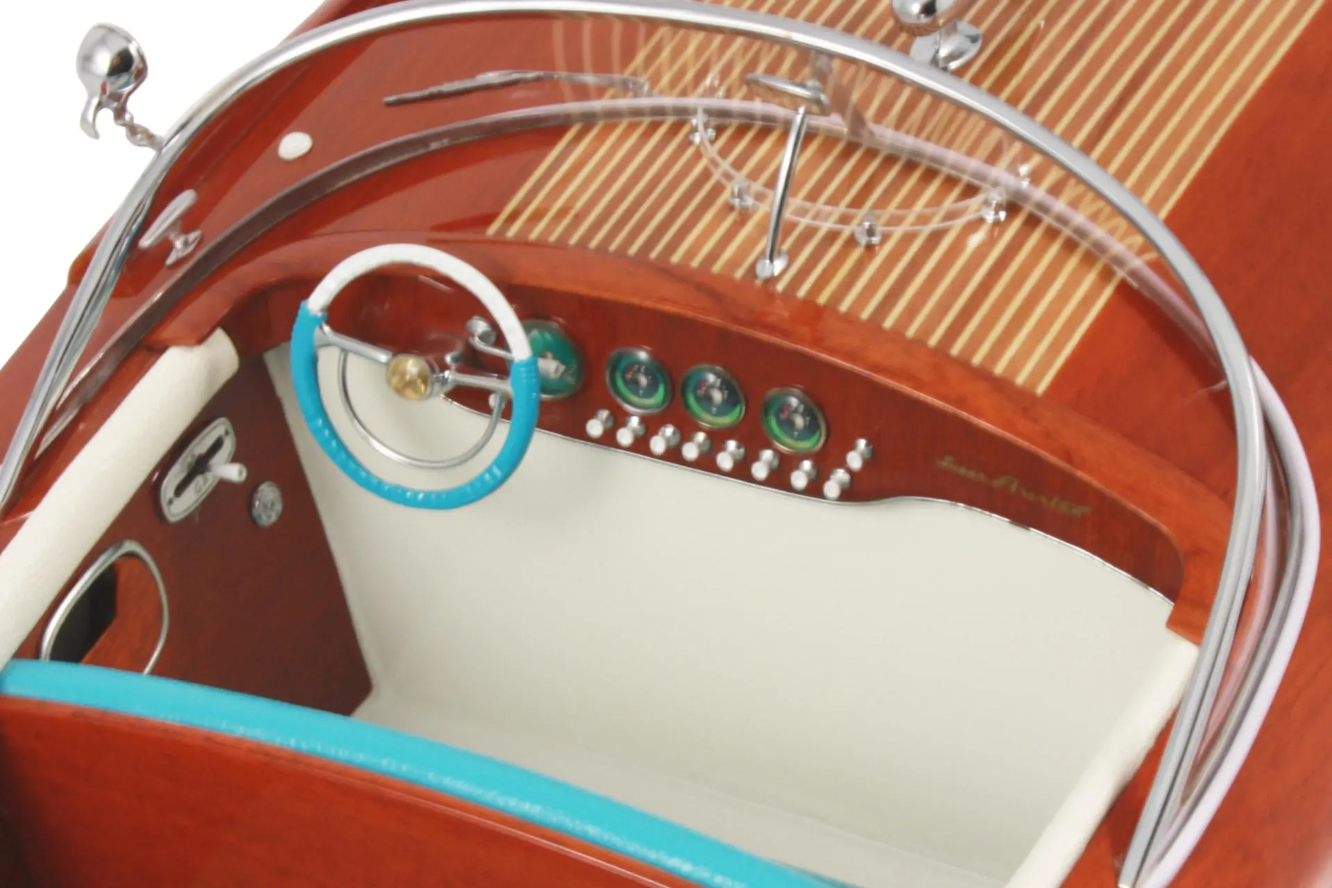 Dieses 69 cm lange Modell ist ein echtes Ausnahmeobjekt und wurde im Maßstab 1:10 angefertigt. Als originalgetreue Nachbildung der eleganten Riva Super Ariston wurde dieses exklusive, offizielle Modell vollständig von Hand aus edlen Materialien gefertigt: Echtholz und marinefarbene Sattlerwaren. Alle Beschläge sind aus verchromtem Messing und werden von Juwelieren nach Maß angefertigt. 10 Lackschichten werden aufgetragen, um einen hervorragenden Glanz und eine hohe Lacktiefe zu erzielen. Das Modell wird mit türkisblauer und weißer Polsterung angeboten (auch mit elfenbeinfarbener Polsterung erhältlich).
