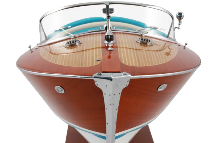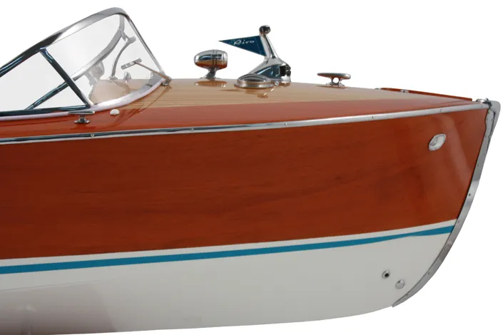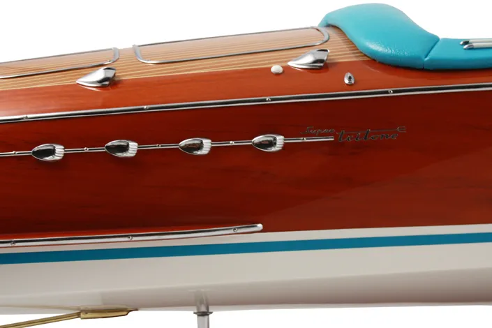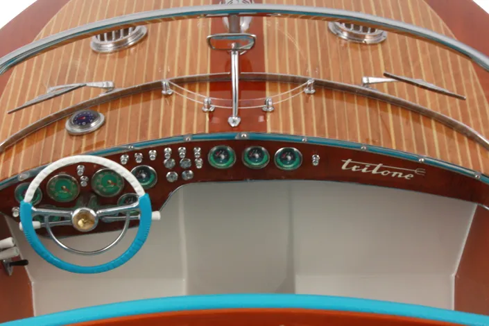 Dieses 82 cm lange Modell ist ein echtes Ausnahmeobjekt und wurde im Maßstab 1:10 angefertigt. Dieses exklusive, offizielle Modell ist ein originalgetreues Replikat der prestigeträchtigen Riva Tritone und wurde vollständig von Hand aus edlen Materialien gefertigt: Echtholz und marinefarbene Sattlerwaren. Alle Beschläge sind aus verchromtem Messing und werden von Juwelieren nach Maß angefertigt. 10 Lackschichten werden aufgetragen, um einen hervorragenden Glanz und eine hohe Lacktiefe zu erzielen. Das Modell wird mit türkisblauer und weißer Polsterung angeboten.